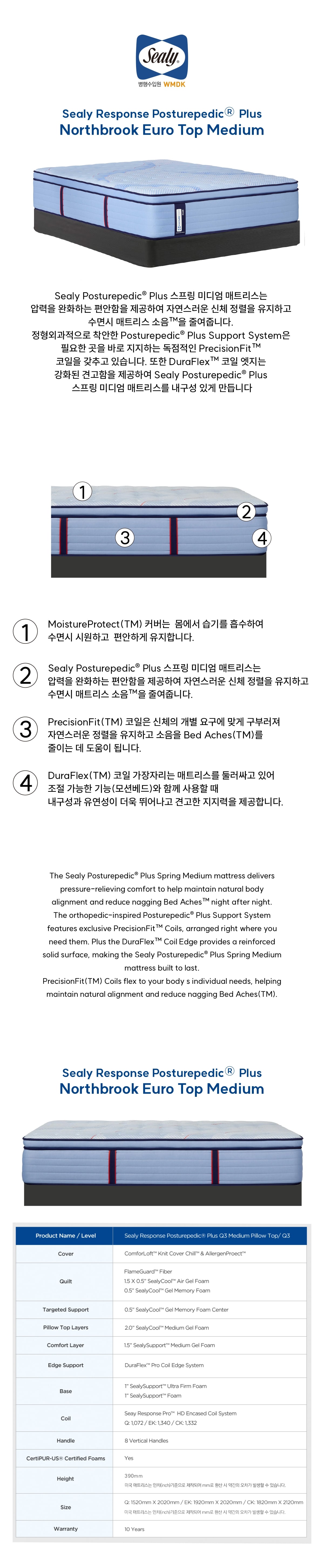| 품명 | 씰리 리스폰스 포스처피딕 플러스 Q3 미디엄 필로우탑 (SEALY Q3 Medium Pillow Top) |