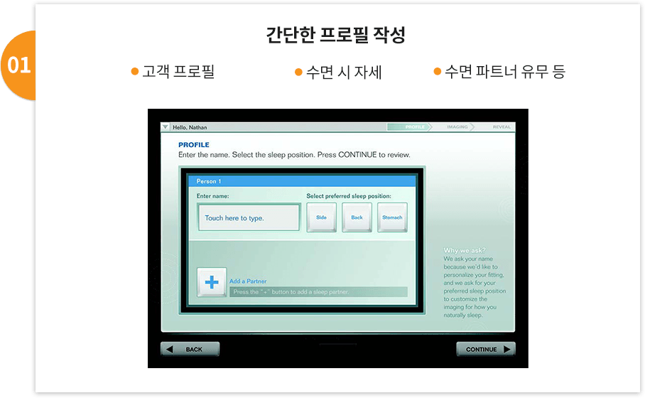 베드랩은 고객님의 수면 프로필 작성 부터 체압 측정 까지 약 5분 내외의 시간이 소요됩니다.