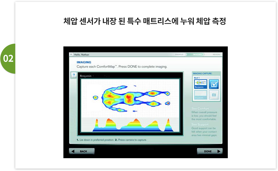 고객님의 실제 수면 자세를 기반으로 측정하여야 매트리스를 추천 받았을 때, 높은 만족도를 보일 수 있습니다.