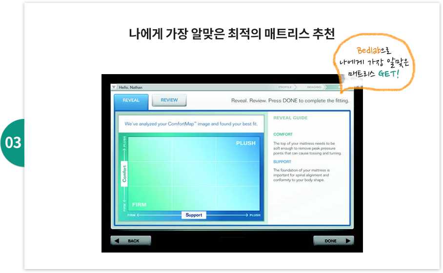 베드랩은 초정밀 체압센서가 내장된 매트리스가 개인의 체압을 측정하고 압점의 분포도를 분석하여 최적의 매트리스를 추천해주는 스마트한 시스템입니다.